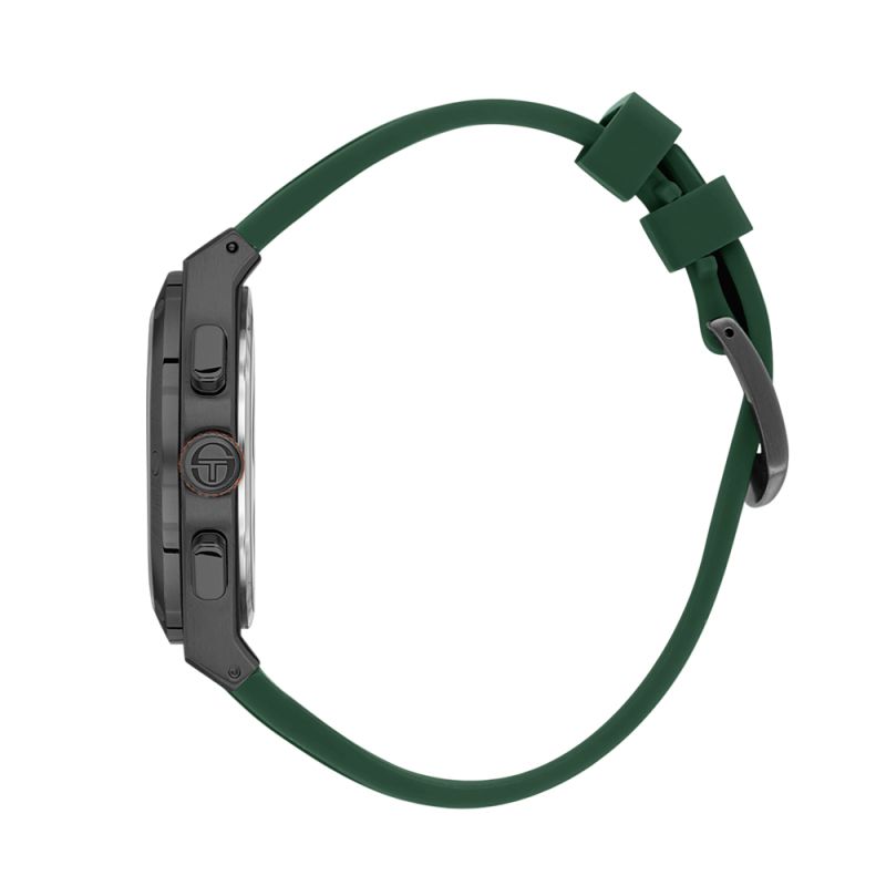 Мъжки часовник Sergio Tacchini със спортно-ежедневен дизайн от колекцията Archivio. Моделът е с мултифункционален дисплей и стъкло минерал-кристал. Корпус изработен от неръждаема стомана. Тъмнозелена силиконова каишка. Диаметър на корпуса 44 мм. Задвижва се от кварцов механизъм. Водоустойчивост 5 ATM - допускат се леки пръски и взимане на душ, не се препоръчва обилно мокрене.