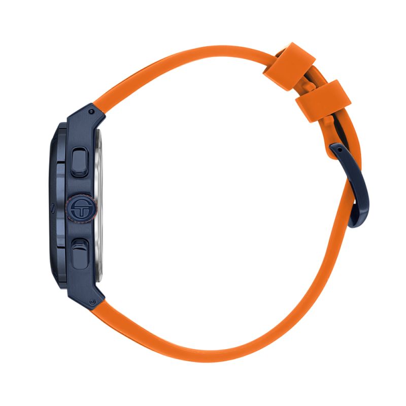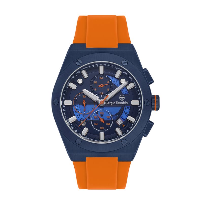 Мъжки часовник Sergio Tacchini с модерен спортен дизайн от колекцията Archivio. Моделът е с мултифункционален дисплей и стъкло минерал-кристал. Корпус изработен от неръждаема стомана.Оранжева силиконова каишка. Диаметър на корпуса 44 мм. Задвижва се от кварцов механизъм. Водоустойчивост 5 ATM - допускат се леки пръски и взимане на душ, не се препоръчва обилно мокрене.