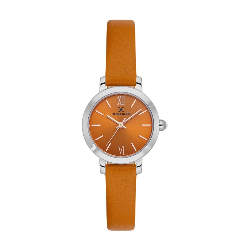 Дамски часовник Daniel Klein със стилен дизайн от колекцията Premium. Аналогов дисплей в оранжев цвят със сребристи стрелки и индекси. Стъкло минерал-кристал. Корпус изработен от метал. Каишка от естествена кожа. Диаметър на корпуса 26 мм. Часовникът се задвижва от кварцов механизъм. Водоустойчивост 3 ATM - допускат се леки пръски, не се препоръчва обилно мокрене.