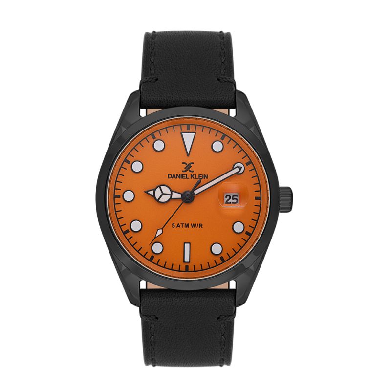 Мъжки часовник Daniel Klein със спортно-елегантен дизайн от колекцията Premium. Аналогов дисплей  в оранжев цвят с показател за дата.Луминесцентно покритие върху стрелките и индексите. Диаметър на корпуса 42 мм. Моделът е с метален корпус и каишка от естествена кожа. Задвижва се от кварцов механизъм. Водоустойчивост 5 ATM - допускат се леки пръски и взимане на душ, не се препоръчва обилно мокрене.