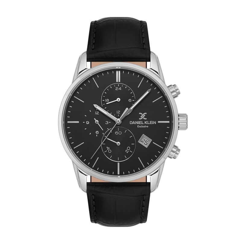 Спортно-елегантен мъжки часовник Daniel Klein от колекцията Exclusive. Черен мултифункционален дисплей със сребристи детайли. Диаметър на корпуса 42 мм. Метален корпус съчетан с каишка от естествена кожа. Часовникът се задвижва от кварцов механизъм. Водоустойчивост 5 ATM - допускат се леки пръски и взимане на душ, не се препоръчва обилно мокрене.