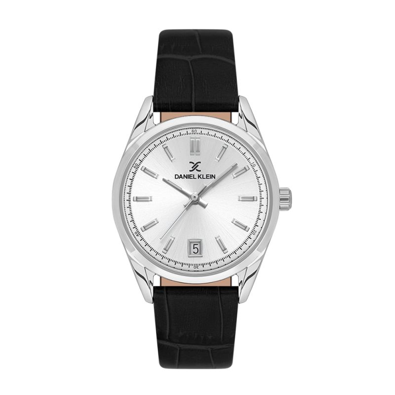 Класически модел дамски часовник Daniel Klein от колекцията Premium. Сребрист аналогов дисплей със семпъл дизайн и показател за дата. Стъкло минерал-кристал. Корпус изработен от метал. Черна каишка от естествена кожа. Диаметър на корпуса 32 мм. Часовникът се задвижва от кварцов механизъм. Водоустойчивост 3 ATM - допускат се леки пръски, не се препоръчва обилно мокрене.