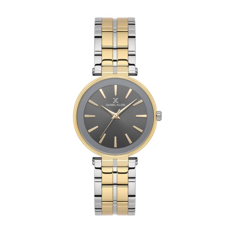 Стилен дамски часовник Daniel Klein с модерна визия от колекцията Premium. Тъмносив аналогов дисплей със златисти стрелки и индекси. Стъкло минерал-кристал. Корпус изработен от метал. Верижка от неръждаема стомана. Диаметър на корпуса 32 мм. Часовникът се задвижва от кварцов механизъм. Водоустойчивост 3 ATM - допускат се леки пръски, не се препоръчва обилно мокрене.