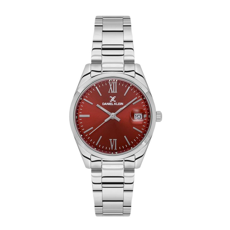 Дамски часовник Daniel Klein от колекцията Premium с класически дизайн. Тъмночервен аналогов дисплей с показател за дата. Стъкло минерал-кристал. Корпус изработен от метал. Сребриста верижка от неръждаема стомана. Диаметър на корпуса 32 мм. Задвижва се от кварцов механизъм. Водоустойчивост 3 ATM - допускат се леки пръски, не се препоръчва обилно мокрене.