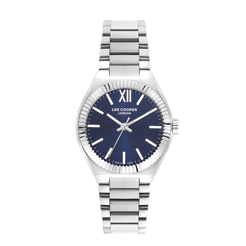 Дамски часовник Lee Cooper с класически дизайн. Тъмносин аналогов дисплей. Луминисцентно покритие на стрелките и индексите. Стъкло минерал-кристал. Корпус от супер метал в комбинация с метална верижка. Задвижва се от кварцов механизъм. Водоустойчивост 3 ATM - допускат се леки пръски, не се препоръчва обилно мокрене.