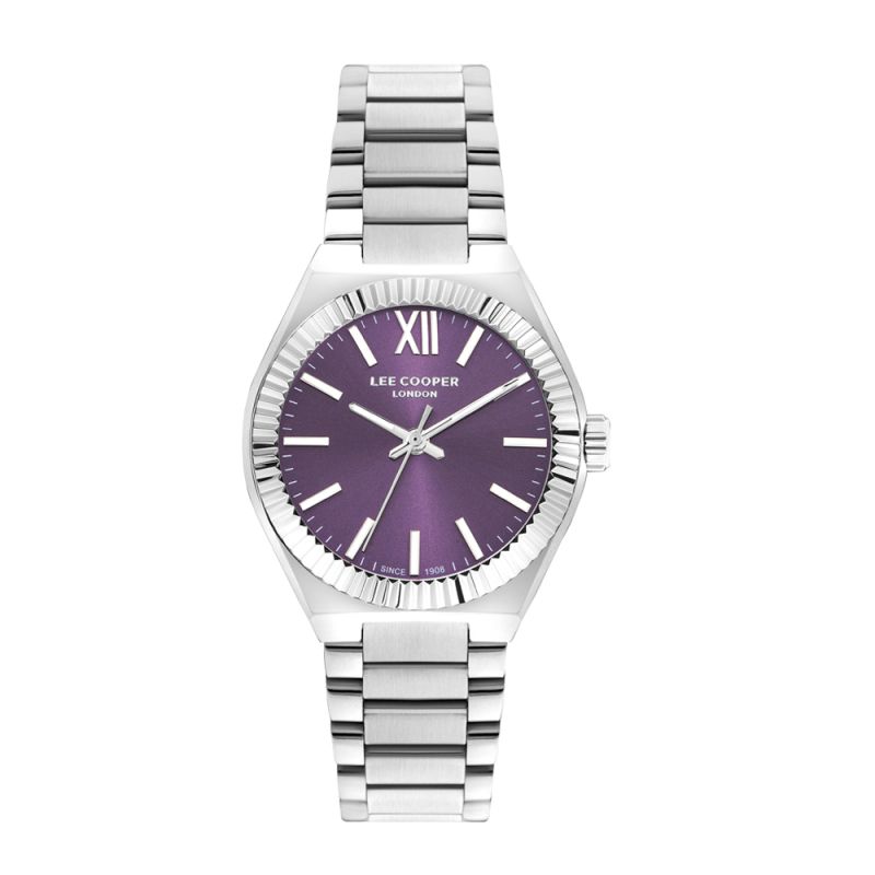 Дамски часовник Lee Cooper с класически дизайн. Лилав аналогов дисплей. Луминисцентно покритие на стрелките и индексите. Стъкло минерал-кристал. Корпус от супер метал в комбинация с метална верижка. Задвижва се от кварцов механизъм. Водоустойчивост 3 ATM - допускат се леки пръски, не се препоръчва обилно мокрене.