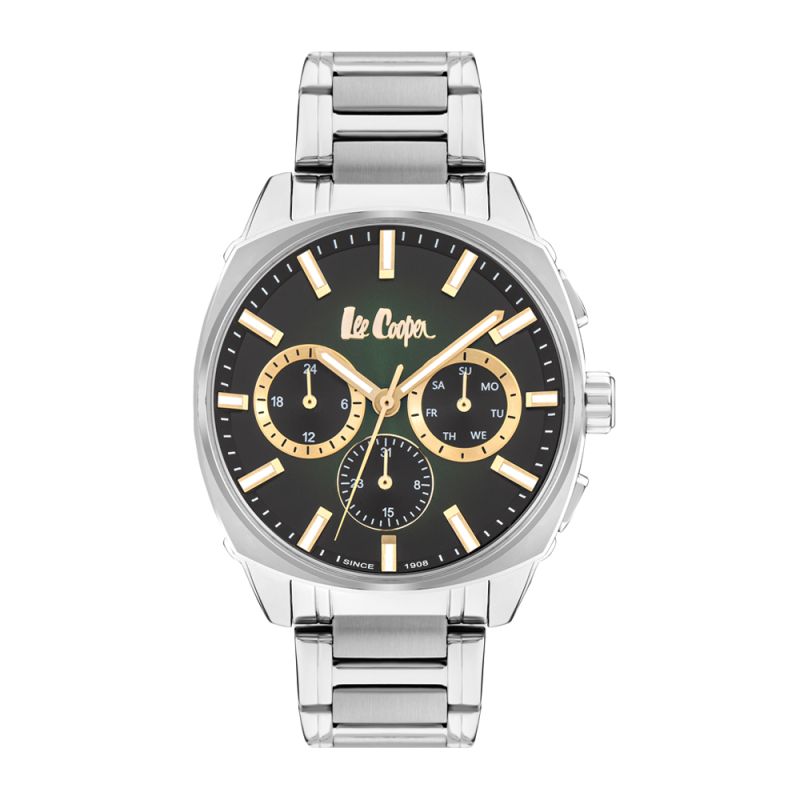 Мъжки часовник Lee Cooper със спортно-елегантен дизайн. Мултифункционален дисплей в зелен цвят със златисти детайли. Луминисцентно покритие върху стрелките и индексите. Стъкло минерал-кристал. Корпус от супер метал, в комбинация с метална верижка. Задвижва се от кварцов механизъм. Водоустойчивост 5 ATM - допускат се леки пръски и взимане на душ, не се препоръчва обилно мокрене.