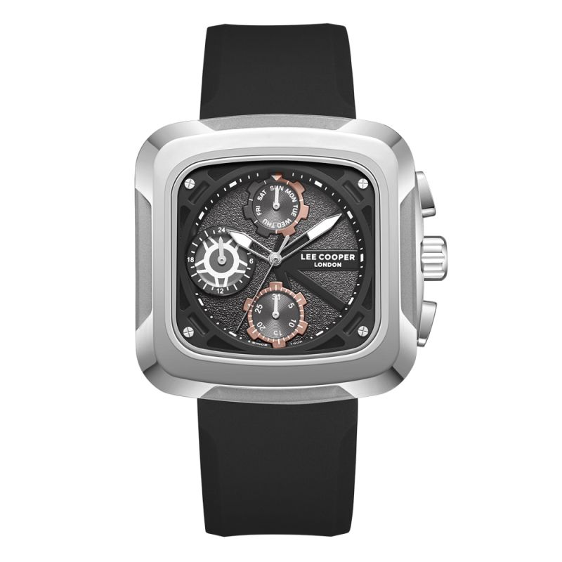 Мъжки часовник Lee Cooper с мултифункционален дисплей. Моделът е с корпус от супер метал и силиконова каишка. Стъкло минерал-кристал. Кварцов механизъм. Водоустойчивост 5 ATM - допускат се леки пръски и взимане на душ, не се препоръчва обилно мокрене.