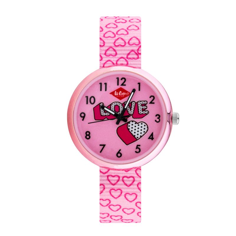 Детски часовник Lee Cooper с принт на сърца. Моделът е с аналогов дисплей и минерално стъкло. Корпус от поликарбонат в комбинация с текстилна каишка. Задвижва се от кварцов механизъм. Водоустойчивост 3 ATM - допускат се леки пръски, не се препоръчва обилно мокрене.