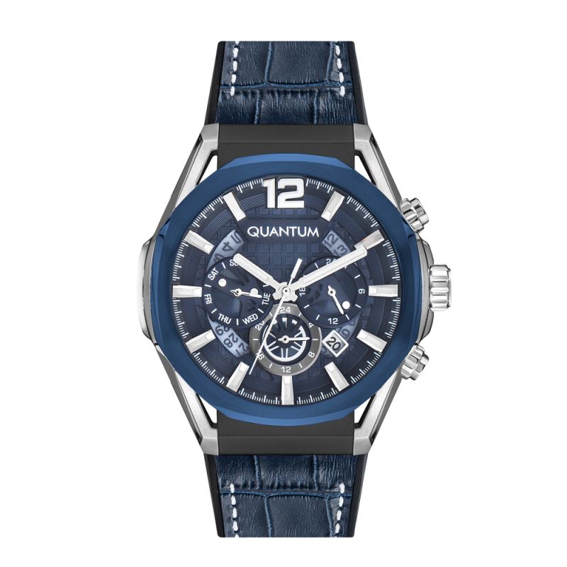 Спортно-елегантен мъжки часовник Quantum с мултифункционален дисплей. Стъкло минерал-кристал с антирефлексно покритие. Корпус от неръждаема стомана. Каишка комбинация от естествена кожа и силикон. Кварцов механизъм. Водоустойчивост 10 ATM - позволява мокрене, къпане и плуване във водни басейни.