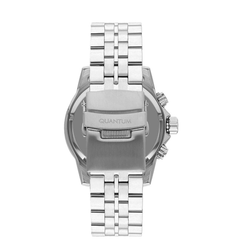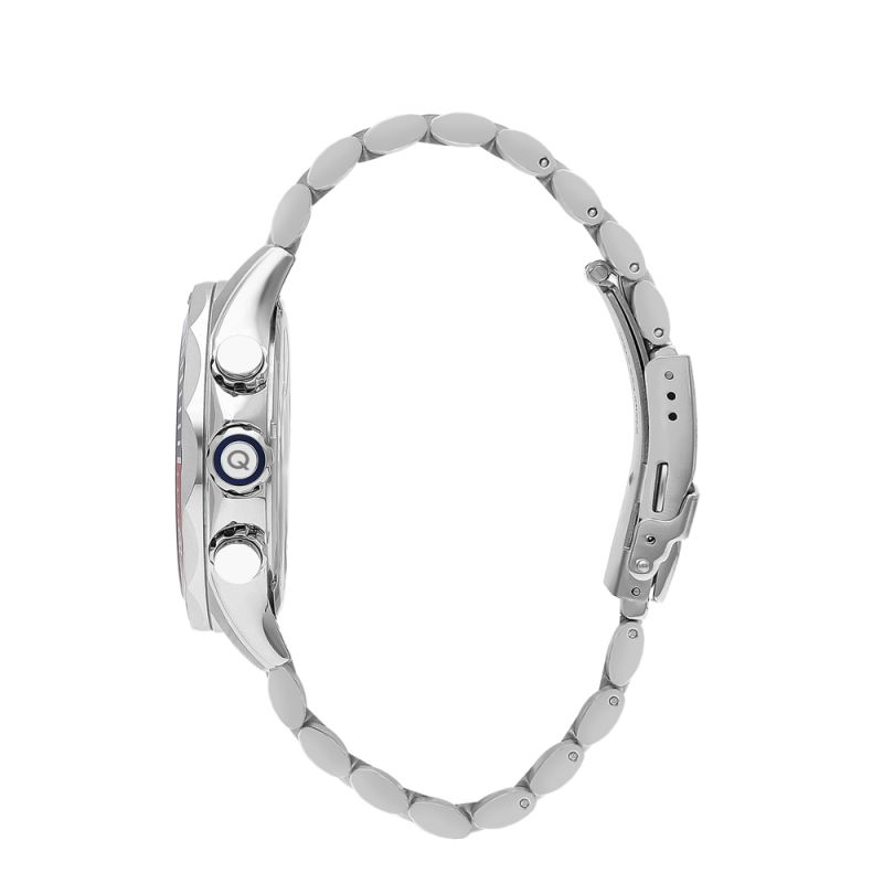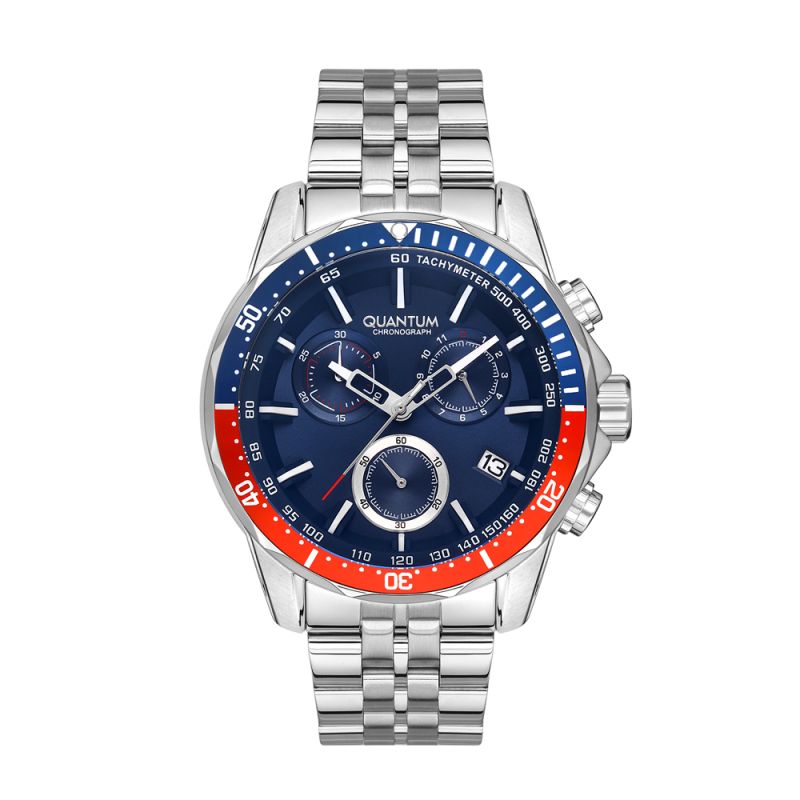 Спортно-елегантен мъжки часовник Quantum с дисплей хронограф. Безел в син и червен цвят. Стъкло минерал-кристал с антирефлексно покритие. Корпус и верижка от неръждаема стомана. Задвижва се от кварцов механизъм. Водоустойчивост 10 ATM - позволява мокрене, къпане и плуване във водни басейни.