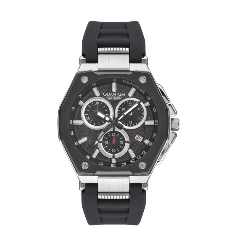 Страхотен модел мъжки часовник Quantum с дисплей хронограф. Стъкло минерал-кристал с антирефлексно покритие. Корпус от неръждаема стомана. Силиконова каишка в черен цвят. Часовникът се задвижва от кварцов механизъм. Водоустойчивост 10 ATM - позволява мокрене, къпане и плуване във водни басейни.