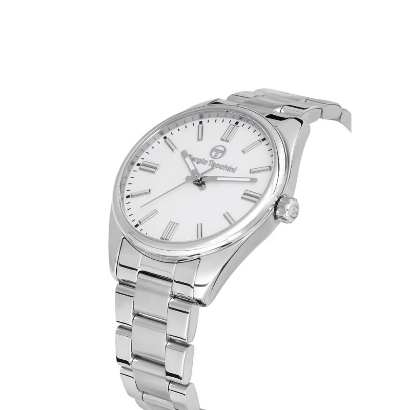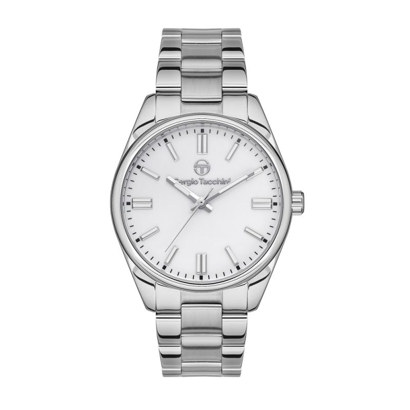 Класически модел дамски часовник Sergio Tacchini от колекцията Coastlife. Корпус и верижка от неръждаема стомана. Керамичен бял циферблат. Луминисцентно покритие на стрелките и индексите. Минерално стъкло, устойчиво на надраскване. Кварцов механизъм. Водоустойчивост 5 ATM - допускат се леки пръски и взимане на душ, не се препоръчва обилно мокрене.