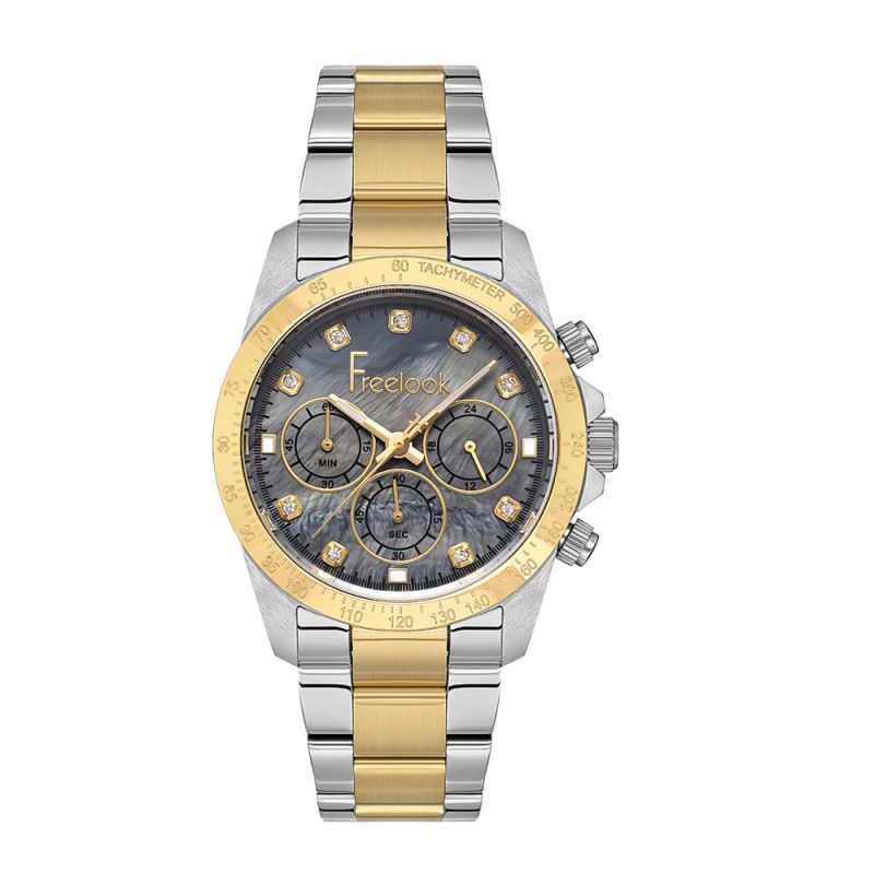 Дамски часовник Freelook от колекцията Charmant. Дисплей тип хронограф в черен седефен цвят с декорация от кристали по индексите и луминисцентно покритие върху стрелките. Стъкло минерал-кристал. Корпус и верижка от неръждаема стомана. Задвижва се от кварцов механизъм. Водоустойчивост 5 ATM - допускат се леки пръски и взимане на душ, не се препоръчва обилно мокрене.