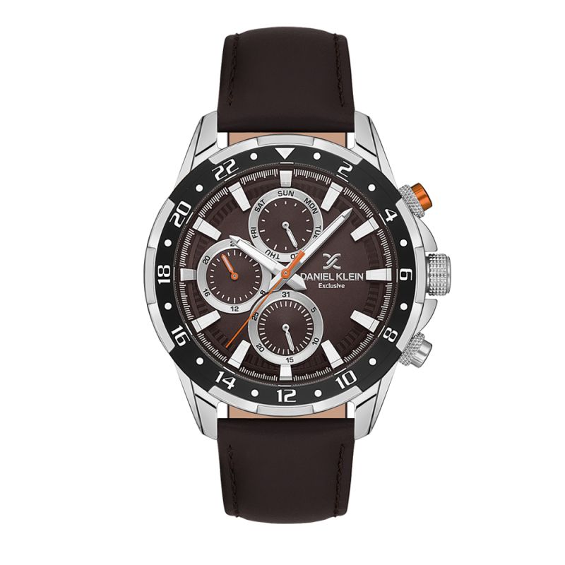 Мъжки часовник Daniel Klein със стилен дизайн от колекцията Exclusive. Кафяв мултифункционален дисплей със сребристи детайли. Стъкло минерал-кристал. Метален корпус. Каишка от естествена кожа. Задвижва се от кварцов механизъм. Водоустойчивост 5 ATM - допускат се леки пръски и взимане на душ, не се препоръчва обилно мокрене.