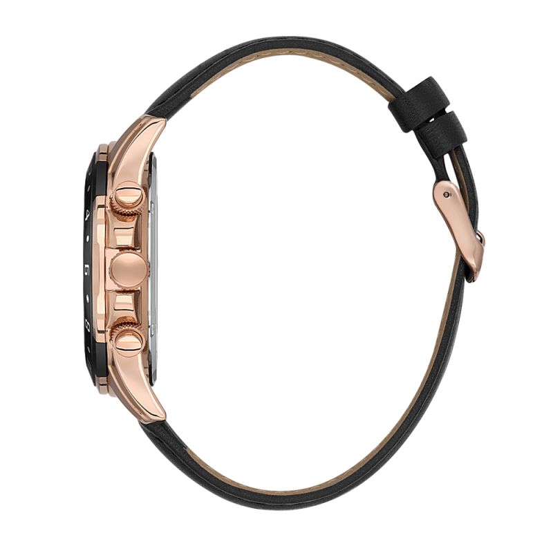 Мъжки часовник Daniel Klein със стилен дизайн от колекцията Exclusive. Черен мултифункционален дисплей с детайли в цвят розово злато. Стъкло минерал-кристал. Метален корпус. Каишка от естествена кожа. Задвижва се от кварцов механизъм. Водоустойчивост 5 ATM - допускат се леки пръски и взимане на душ, не се препоръчва обилно мокрене.