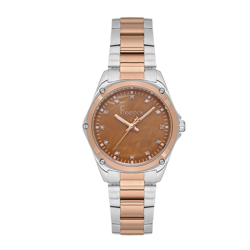 Класически модел дамски часовник Freelook от колекцията Jolie. Аналогов дисплей в седефен кафяв цвят с декорация от кристали върху индексите и луминисцентни стрелки. Стъкло минерал-кристал. Корпус и верижка от неръждаема стомана. Задвижва се от кварцов механизъм. Водоустойчивост 5 ATM - допускат се леки пръски и взимане на душ, не се препоръчва обилно мокрене.