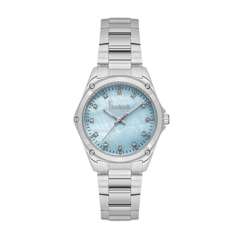 Класически модел дамски часовник Freelook от колекцията Jolie. Аналогов дисплей в седефен син цвят с декорация от кристали върху индексите и луминисцентни стрелки. Стъкло минерал-кристал. Корпус и верижка от неръждаема стомана. Задвижва се от кварцов механизъм. Водоустойчивост 5 ATM - допускат се леки пръски и взимане на душ, не се препоръчва обилно мокрене.