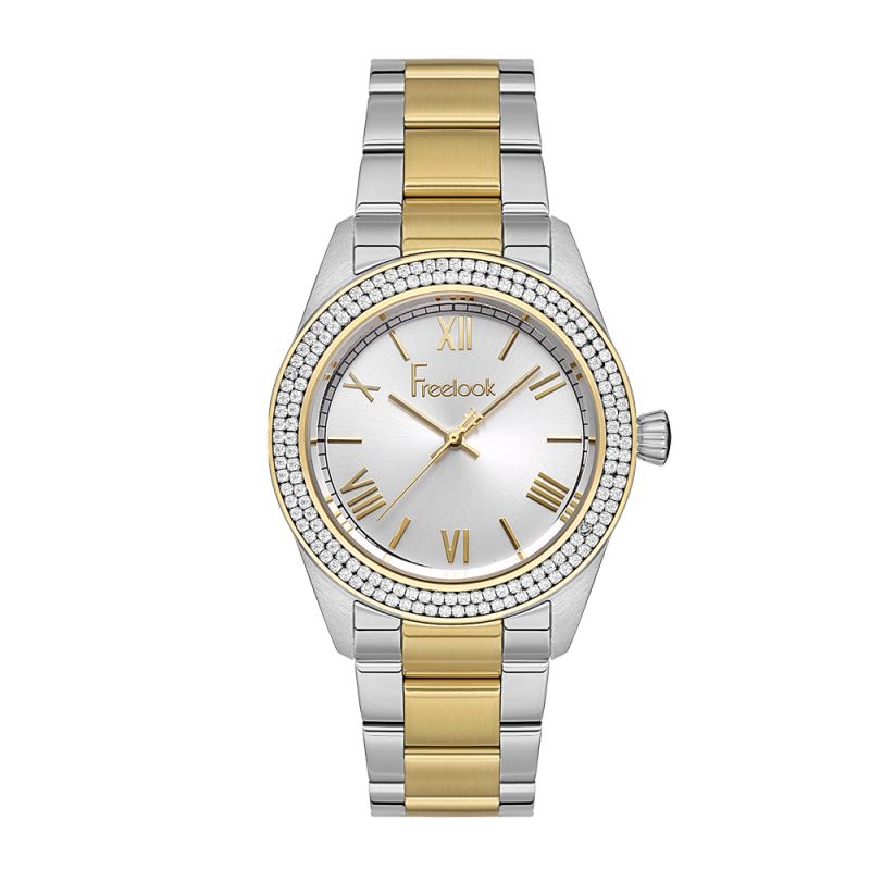 Дамски часовник Freelook с богата декорация от кристали по безела. Сребрист аналогов дисплей с детайли в цвят злато. Стъкло минерал-кристал. Корпус и верижка от неръждаема стомана. Задвижва се от кварцов механизъм. Водоустойчивост 5 ATM - допускат се леки пръски и взимане на душ, не се препоръчва обилно мокрене.