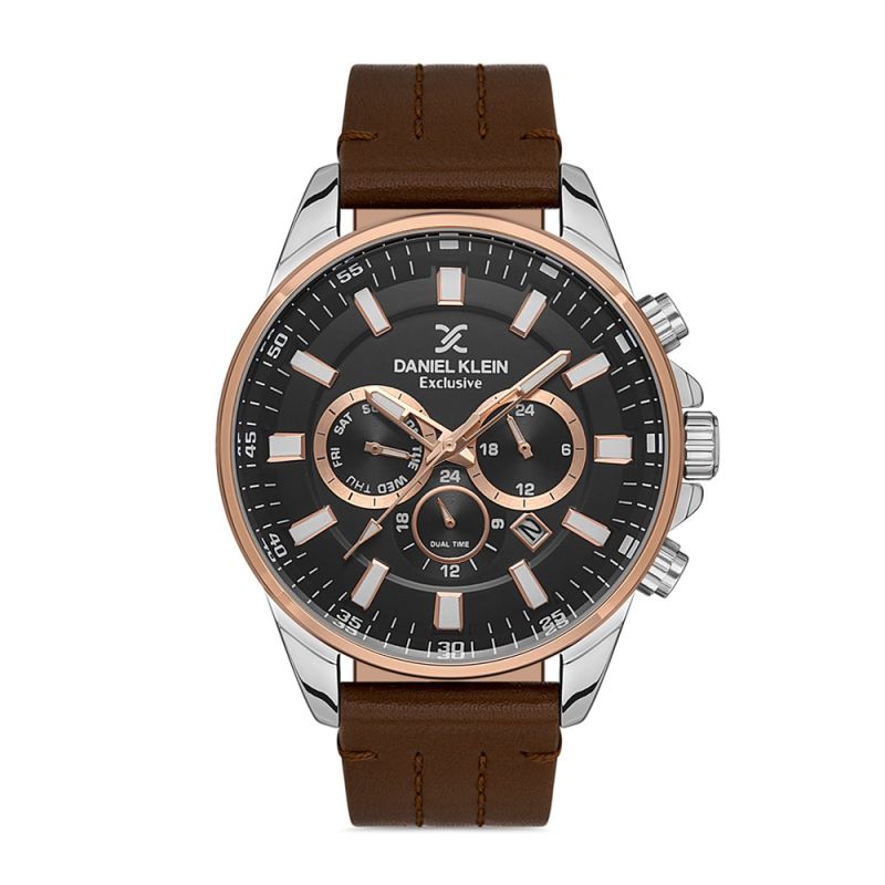 Мъжки часовник Daniel Klein с мултифункционален дисплей от колекцията Exclusive. Стъкло минерал-кристал. Моделът е с метален корпус и каишка от естествена кожа. Задвижва се от кварцов механизъм. Водоустойчивост 5 ATM - допускат се леки пръски и взимане на душ, не се препоръчва обилно мокрене.