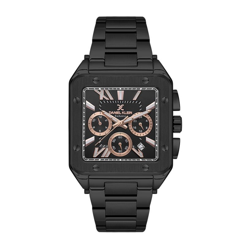 Мъжки часовник Daniel Klein от колекцията Exclusive. Черен мултифункционален дисплей с детайли в цвят розово злато. Стъкло минерал-кристал. Моделът е с метален корпус и верижка от неръждаема стомана. Задвижва се от кварцов механизъм. Водоустойчивост 5 ATM - допускат се леки пръски и взимане на душ, не се препоръчва обилно мокрене.