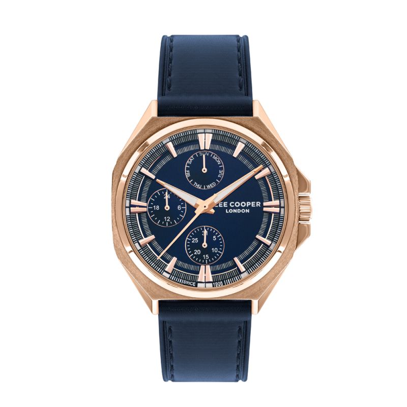 Спортно-елегантен мъжки часовник Lee Cooper с мултифункционален дисплей. Стъкло минерал-кристал. Корпус изработен от супер метал. Каишка от естествена кожа. Кварцов механизъм. Водоустойчивост 5 ATM - допускат се леки пръски и взимане на душ, не се препоръчва обилно мокрене.