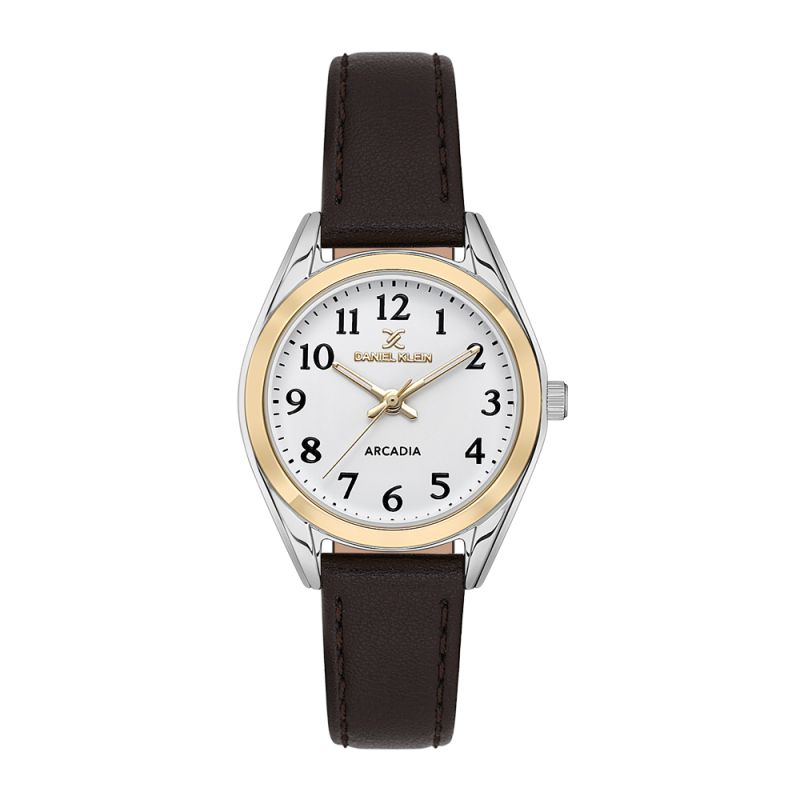 Дамски часовник Daniel Klein с класиески дизайн от колекцията Arcadia. Моделът е с аналогов дисплей и минерално стъкло. Метален корпус в комбинация с каишка от естествена кожа. Задвижва се от кварцов механизъм. Водоустойчивост 3 ATM - допускат се леки пръски, не се препоръчва обилно мокрене.