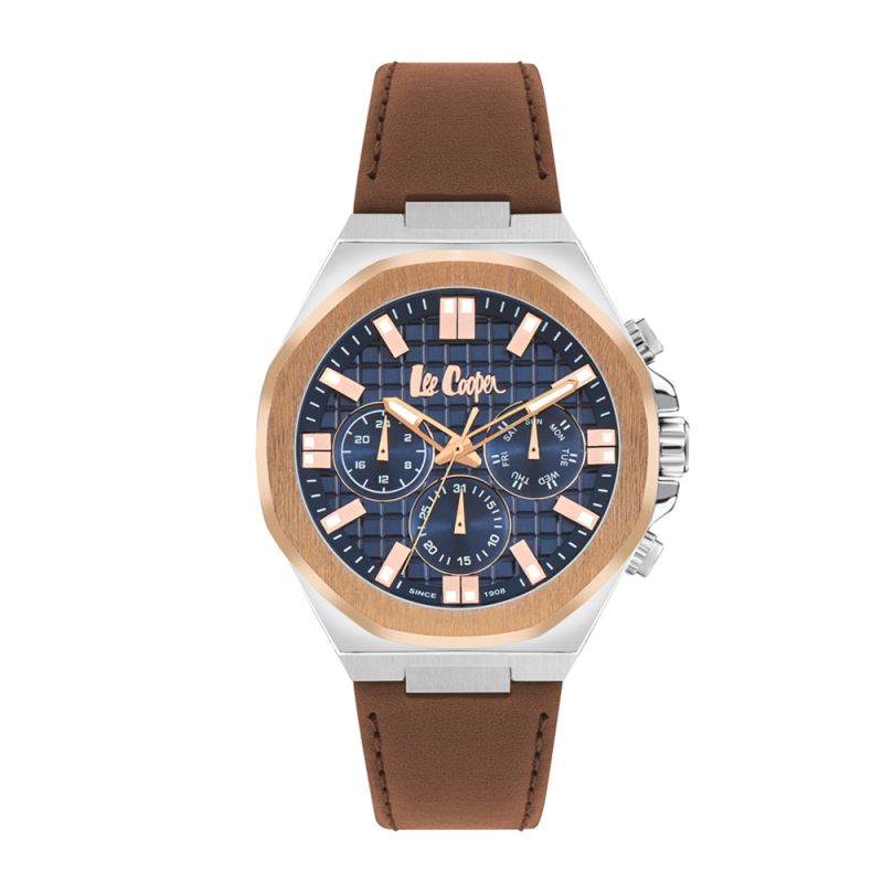 Спортно-елегантен мъжки часовник Lee Cooper с мултифункционален дисплей. Стъкло минерал-кристал. Корпус изработен от супер метал. Кафява каишка от естествена кожа. Кварцов механизъм. Водоустойчивост 5 ATM - допускат се леки пръски и взимане на душ, не се препоръчва обилно мокрене.