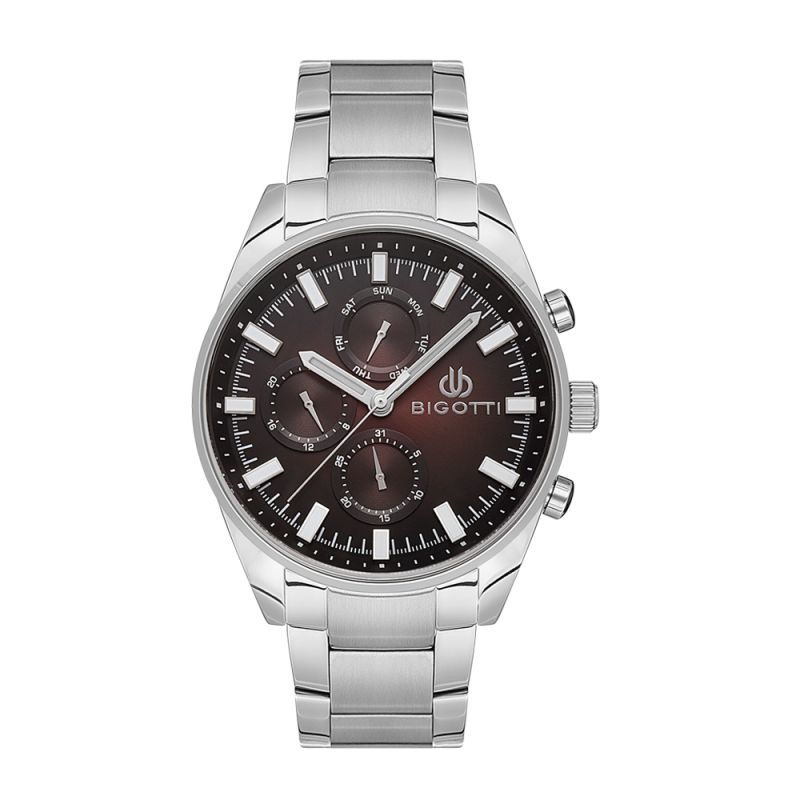 Мъжки часовник Bigotti със спортно-ежедневен дизайн. Метален корпус в комбинация с верижка от неръждаема стомана. Мултифункционален дисплей с луминисцентно покритие на стрелките и индексите. Стъкло минерал-кристал. Кварцов механизъм. Водоустойчивост 5 ATM - допускат се леки пръски и взимане на душ, не се препоръчва обилно мокрене.