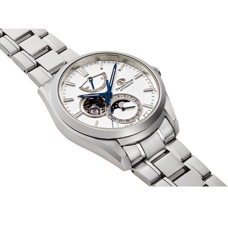 Мъжки часовник Orient Star с уникалният дизайн, вдъхновен от концепцията за наблюдение на Земята зад Луната. Моделът е с полускелетонизиран дисплей с видим баланс, индикатор за резервна мощност, индикатор за дата и лунна фаза. Корпусът и верижката са изработени от висококачествена неръждаема стомана. Стъклото е сапфир-кристал с антирефлексно покритие. През прозрачния гръб на корпуса, може да се наблюдава механизма. Часовникът се задвижва от японски автоматичен механизъм F7M63 с 50 часа резервна мощност. Водоустойчивост 10 ATM - позволява мокрене, къпане и плуване във водни басейни.