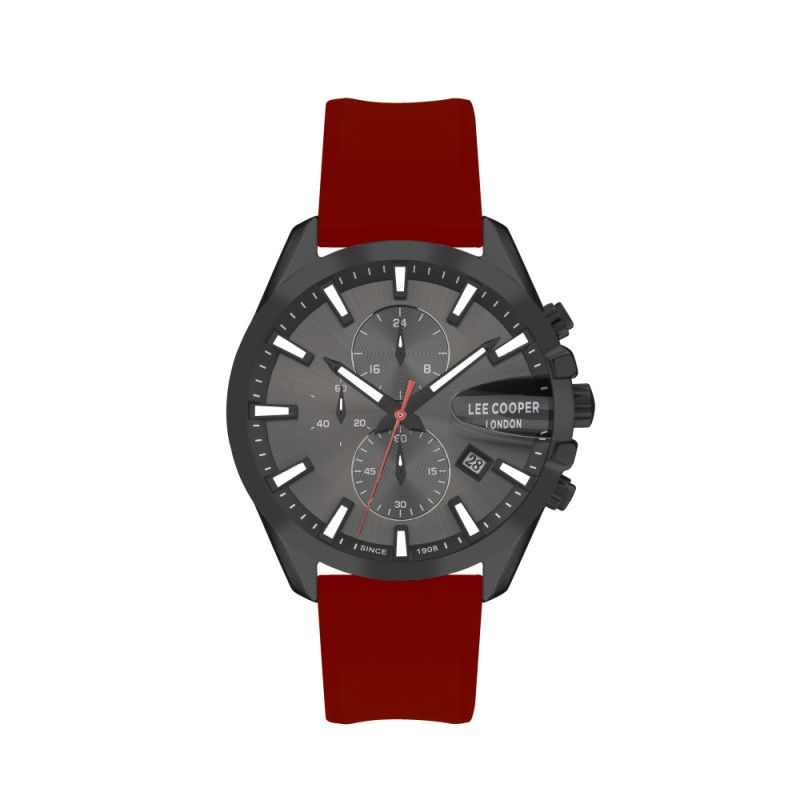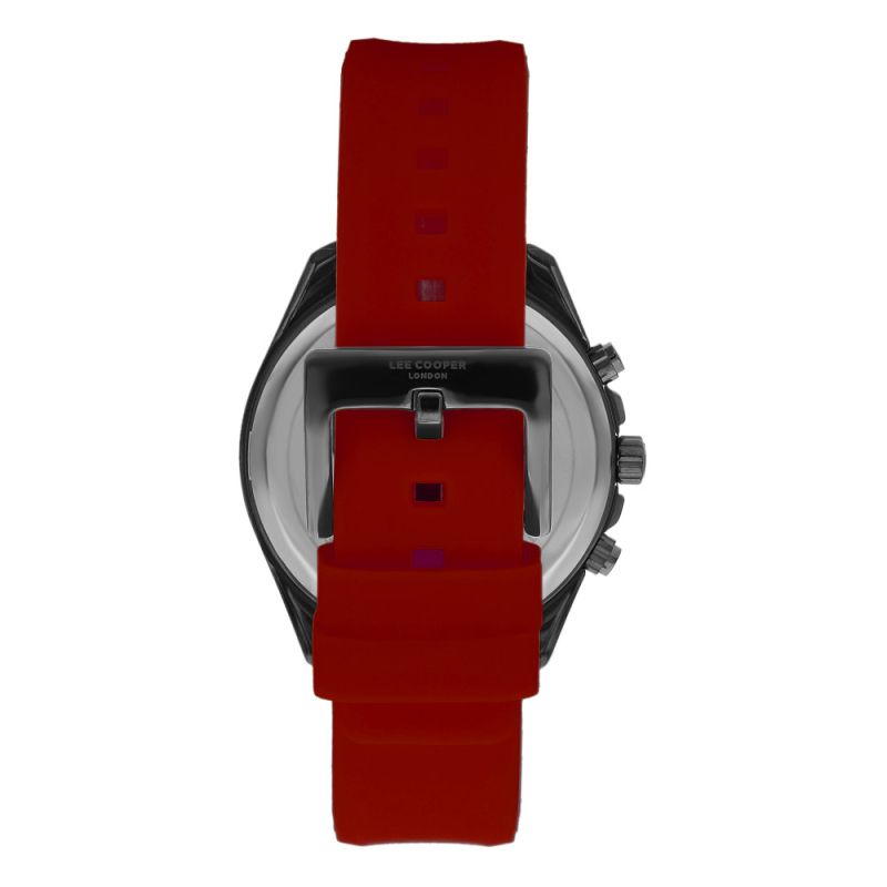 Мъжки часовник Lee Cooper със спортна и модерна визия. Моделът е с черен мултифункционален дисплей, съчетан с червена силиконова каишка. Корпус от супер метал и стъкло минерал-кристал. Кварцов механизъм. Водоустойчивост 5 ATM - допускат се леки пръски и взимане на душ, не се препоръчва обилно мокрене.