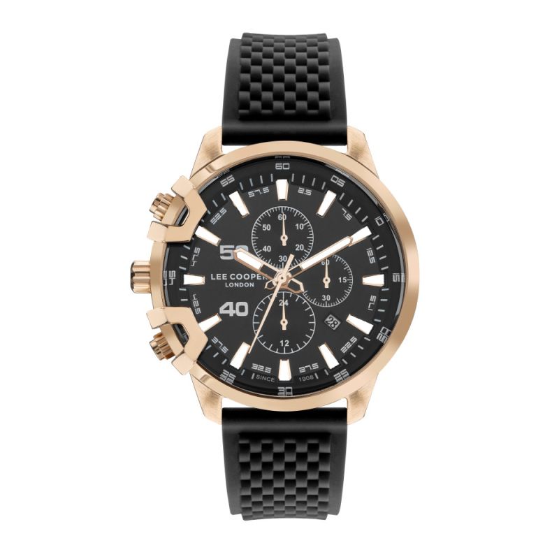 Мъжки часовник Lee Cooper със спортен дизайн. Моделът е с черен дисплей хронограф, съчетан със силиконова каишка. Корпус от супер метал. Стъкло минерал-кристал.  Задвижва се от кварцов механизъм. Водоустойчивост 3 ATM - допускат се леки пръски, не се препоръчва обилно мокрене.