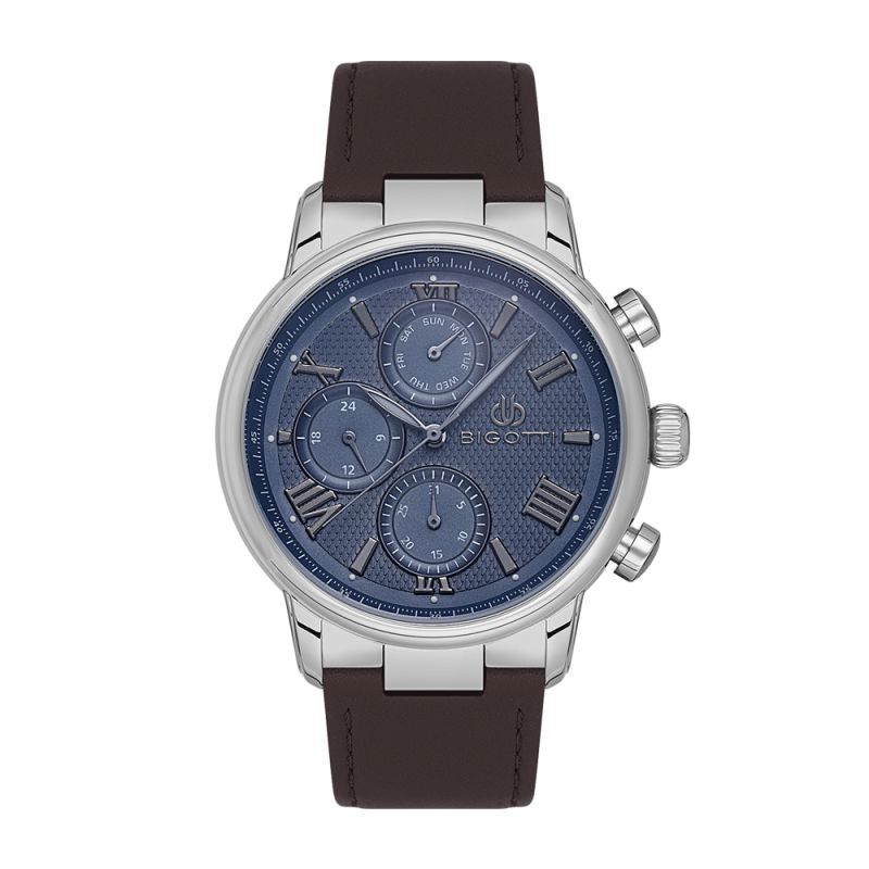 Стилен мъжки часовник Bigotti с мултифункционален дисплей. Стъкло минерал-кристал. Моделът е с метален корпус и каишка от естествена кожа. Задвижва се от кварцов механизъм. Водоустойчивост 5 ATM - допускат се леки пръски и взимане на душ, не се препоръчва обилно мокрене.