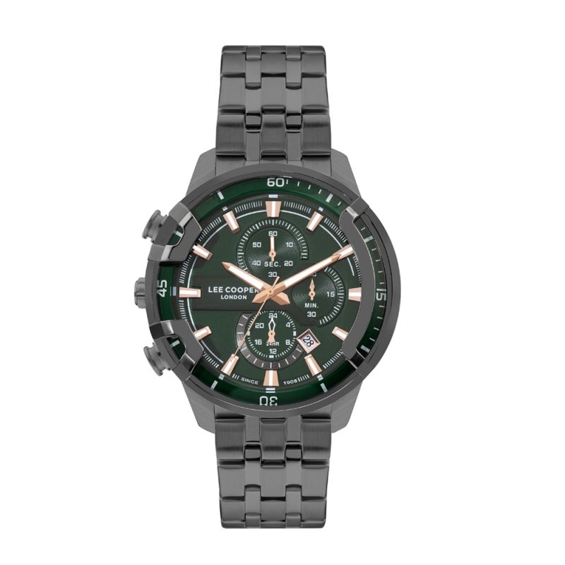 Спортно-елегантен мъжки часовник Lee Cooper с дисплей тип хронограф. Корпус от супер метал, в комбинация с метална верижка. Стъкло минерал-кристал. Задвижва се от кварцов механизъм. Водоустойчивост 5 ATM - допускат се леки пръски и взимане на душ, не се препоръчва обилно мокрене.