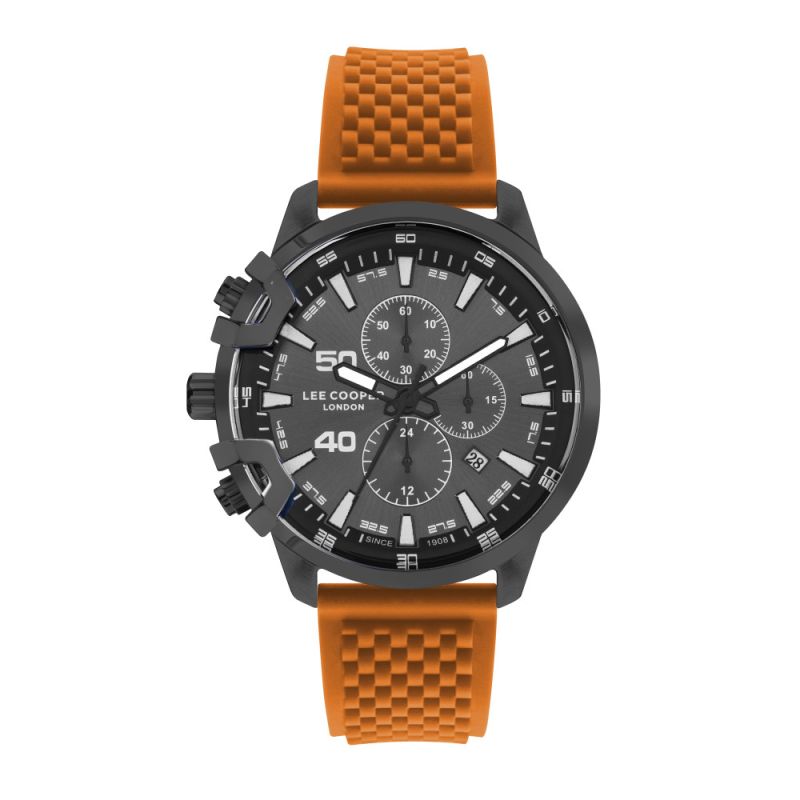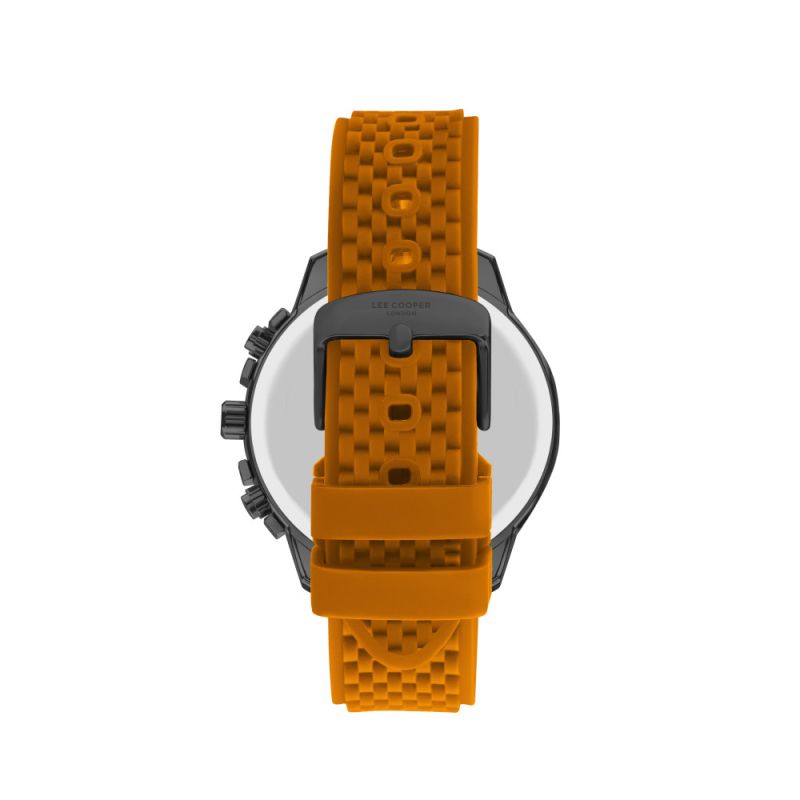 Мъжки часовник Lee Cooper със спортен дизайн. Моделът е с черен дисплей хронограф, съчетан с оранжева силиконова каишка. Корпус от супер метал. Стъкло минерал-кристал. Задвижва се от кварцов механизъм. Водоустойчивост 3 ATM - допускат се леки пръски, не се препоръчва обилно мокрене.