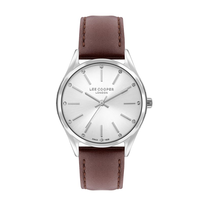 Дамски часовник Lee Cooper с елегантна визия. Сребрист аналогов дисплей с нежни кристали по индексите. Стъкло минерал-кристал. Корпус от супер метал. Кафява каишка от естествена кожа. Задвижва се от кварцов механизъм. Водоустойчивост 3 ATM - допускат се леки пръски, не се препоръчва обилно мокрене.