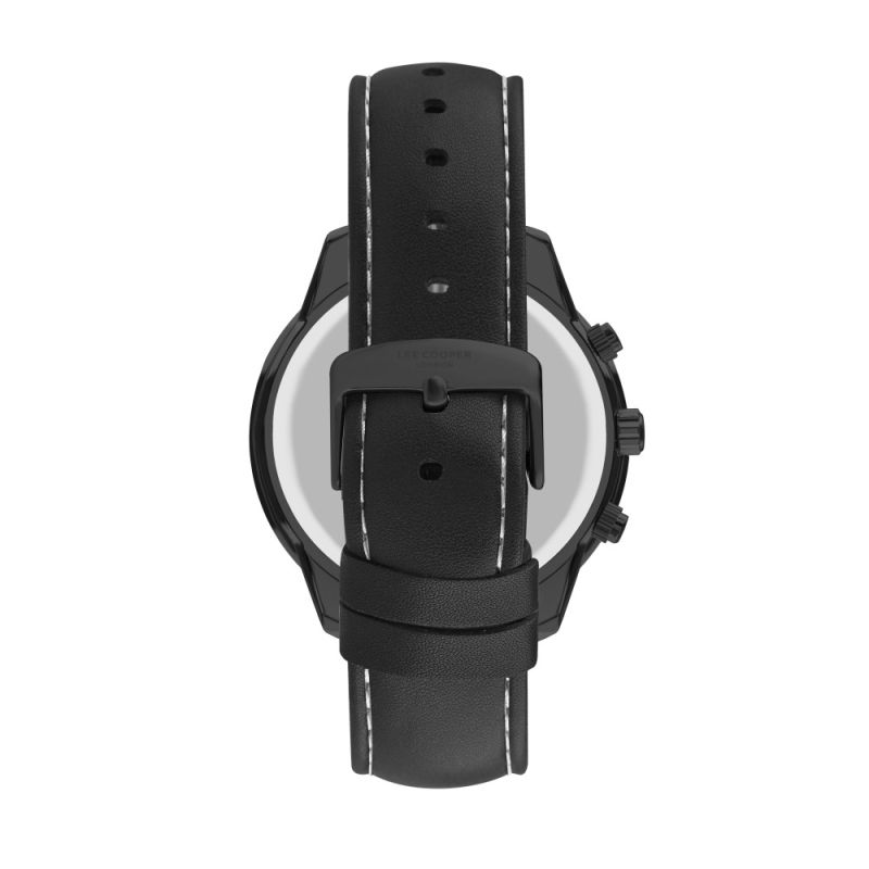 Спортно-елегантен мъжки часовник Lee Cooper с черен дисплей хронограф. Моделът е с корпус от супер метал и стъкло минерал-кристал. Каишка от естествена кожа. Кварцов механизъм. Водоустойчивост 5 ATM - допускат се леки пръски и взимане на душ, не се препоръчва обилно мокрене.