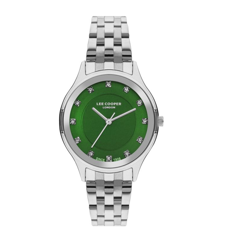 Дамски часовник Lee Cooper от колекцията Elegance. Зелен аналогов дисплей със сребристи стрелки и нежни кристали по индексите. Стъкло минерал-кристал. Корпус от супер метал в комбинация с метална верижка. Задвижва се от кварцов механизъм. Водоустойчивост 3 ATM - допускат се леки пръски, не се препоръчва обилно мокрене.