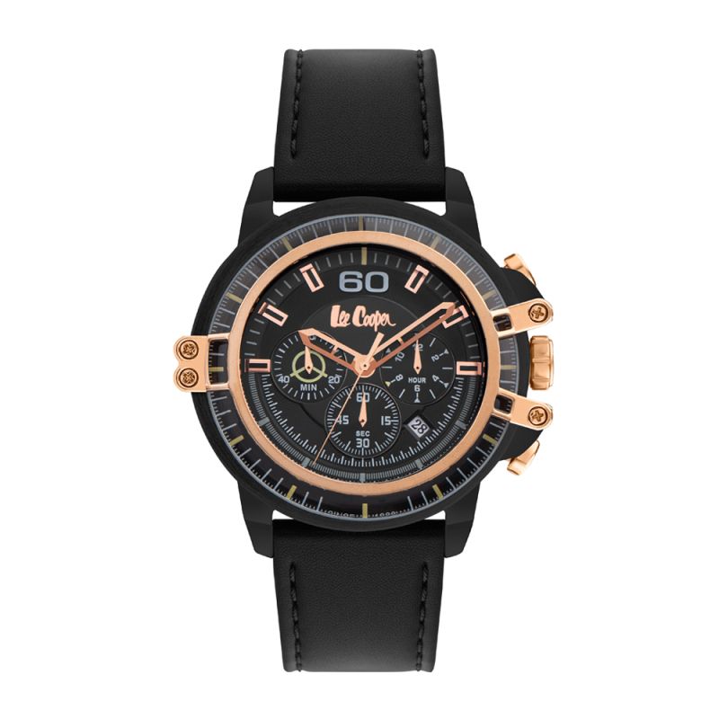 Спортно-елегантен мъжки часовник Lee Cooper с дисплей тип хронограф. Корпус изработен от супер метал. Черна каишка от естествена кожа. Стъкло минерал-кристал. Задвижва се от кварцов механизъм. Водоустойчивост 5 ATM - допускат се леки пръски и взимане на душ, не се препоръчва обилно мокрене.