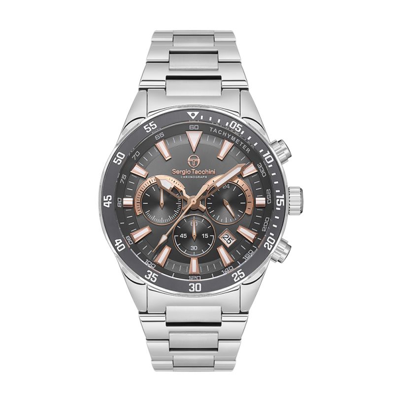 Спортно-елегантен мъжки часовник Sergio Tacchini с дисплей хронограф. Корпус и верижка от неръждаема стомана. Стъкло минерал-кристал. Задвижва се от кварцов механизъм. Водоустойчивост 5 ATM - допускат се леки пръски и взимане на душ, не се препоръчва обилно мокрене.