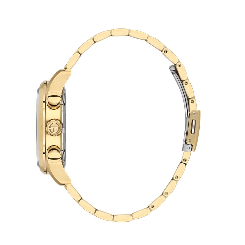 Спортно-елегантен мъжки часовник Sergio Tacchini с дисплей тип хронограф. Корпус и верижка от неръждаема стомана. Стъкло минерал-кристал. Кварцов механизъм. Водоустойчивост 5 ATM - допускат се леки пръски и взимане на душ, не се препоръчва обилно мокрене.