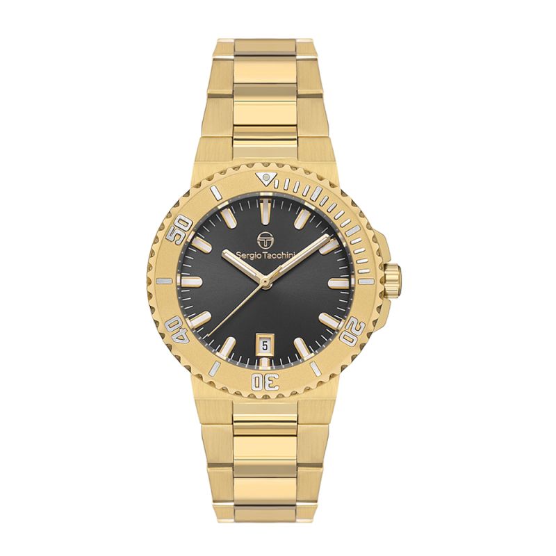 Класически модел дамски часовник Sergio Tacchini със стилен дизайн. Корпус и верижка от неръждаема стомана. Черен аналогов дисплей с показател за дата. Луминисцентно покритие на стрелките и индексите. Стъкло минерал-кристал. Кварцов механизъм. Водоустойчивост 5 ATM - допускат се леки пръски и взимане на душ, не се препоръчва обилно мокрене.