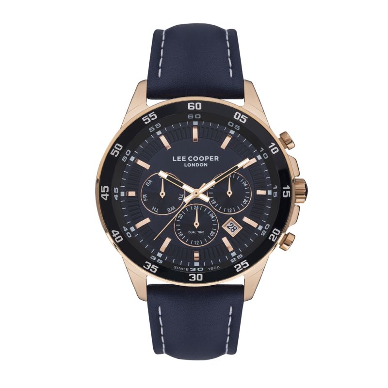 Мъжки спортно-елегантен часовник Lee Cooper с мултифункционален дисплей. Моделът е с корпус изработен от специална сплав - супер метал. Каишка от естествена кожа. Стъкло минерал-кристал. Кварцов механизъм. Водоустойчивост 5 ATM - допускат се леки пръски и взимане на душ, не се препоръчва обилно мокрене.
