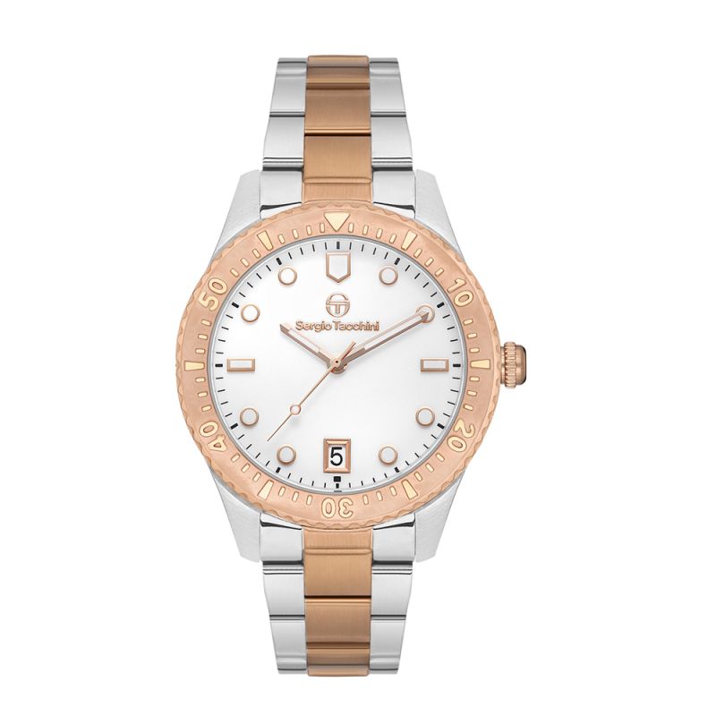 Класически модел дамски часовник Sergio Tacchini със стилен дизайн. Корпус и верижка от неръждаема стомана. Аналгов дисплей с показател за дата. Луминисцентно покритие на стрелките и индексите. Стъкло минерал-кристал. Кварцов механизъм. Водоустойчивост 5 ATM - допускат се леки пръски и взимане на душ, не се препоръчва обилно мокрене.