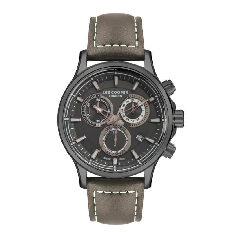 Класически модел мъжки часовник Lee Cooper със сиво-кафяв дисплей тип хронограф. Корпус изработен от супер метал. Каишка от естествена кожа. Стъкло минерал-кристал. Кварцов механизъм. Водоустойчивост 5 ATM - допускат се леки пръски и взимане на душ, не се препоръчва обилно мокрене.