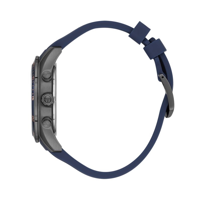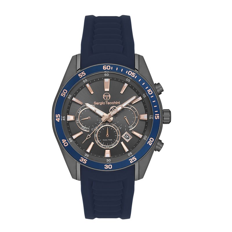 Мъжки часовник Sergio Tacchini със спортно-елегантен дизайн. Корпус от неръждаема стомана, съчетан с тъмносиня силиконова каишка. Сив мултифункционален дисплей със стрелки и индекси в цвят розово злато. Стъкло минерал-кристал. Кварцов механизъм. Водоустойчивост 5 ATM - допускат се леки пръски и взимане на душ, не се препоръчва обилно мокрене.