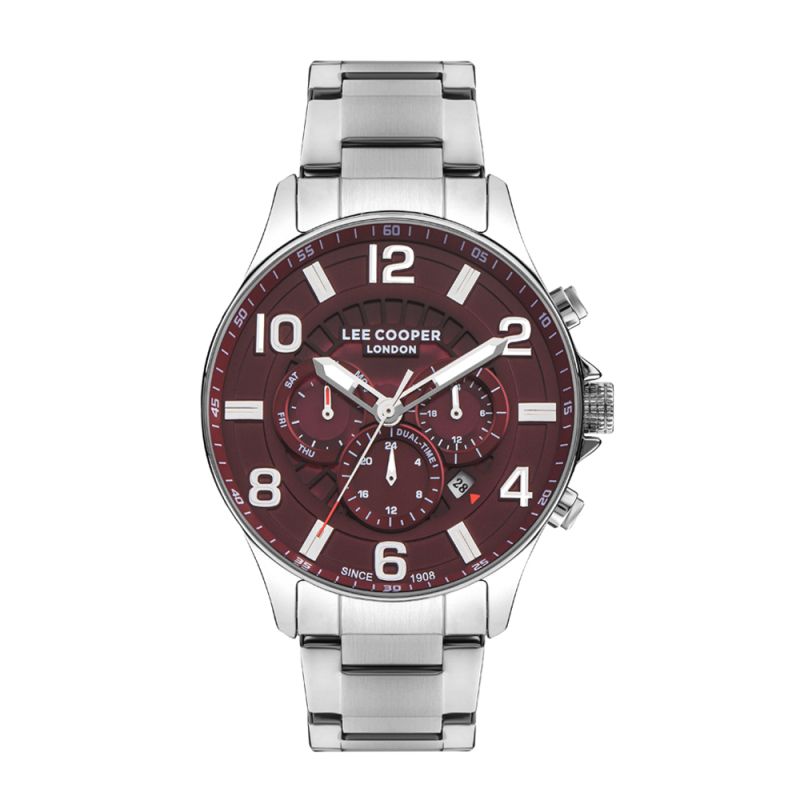 Мъжки часовник Lee Cooper с корпус от супер метал. Мултифункционален дисплей с показатели за дата, ден и двойно време. Стъкло минерал-кристал. Метална верижка в сребрист цвят. Моделът се задвижва от кварцов механизъм. Водоустойчивост 5 ATM - допускат се леки пръски и взимане на душ, не се препоръчва обилно мокрене.