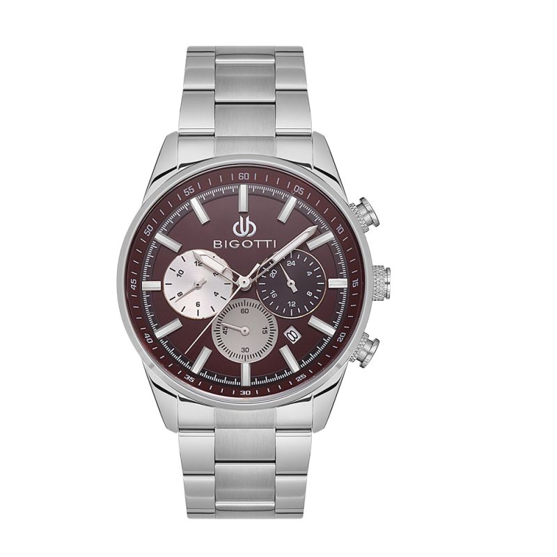 Страхотен модел мъжки часовник Bigotti с дисплей тип хронограф. Метален корпус в комбинация с верижка от неръждаема стомана. Стъкло минерал-кристал. Кварцов механизъм. Водоустойчивост 5 ATM - допускат се леки пръски и взимане на душ, не се препоръчва обилно мокрене.