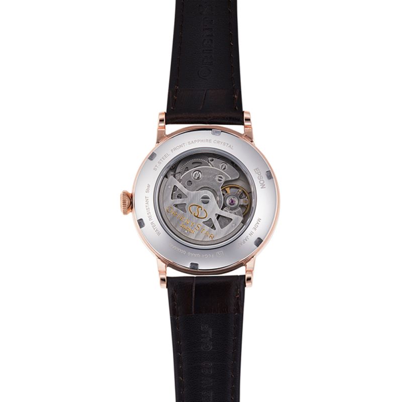 Мъжки часовник Orient Star със стилен дизайн. Моделът е с корпус от неръждаема стомана и каишка от естствена кожа. Дисплеят е аналогов с индикатор за резервна мощност, показател за дата и отделен секундарник. Стъклото е сапфир-кристал с антирефлексно покритие. Задвижва се от автоматичен механизъм F6G42 с 24 камъка и 50 часа резервна мощност. Механизмът може да се наблюдава през прозрачния гръб на корпуса. Водоустойчивост 5 ATM - допускат се леки пръски и взимане на душ, не се препоръчва обилно мокрене.