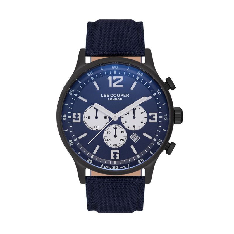 Спортен модел мъжки часовник Lee Cooper със синя текстилна каишка. Корпус от супер метал и стъкло от минерал-кристал. Дисплеят е син хронограф с дата . Задвижва се от кварцов механизъм. Водоустойчивост 3 ATM - допускат се леки пръски, не се препоръчва обилно мокрене.